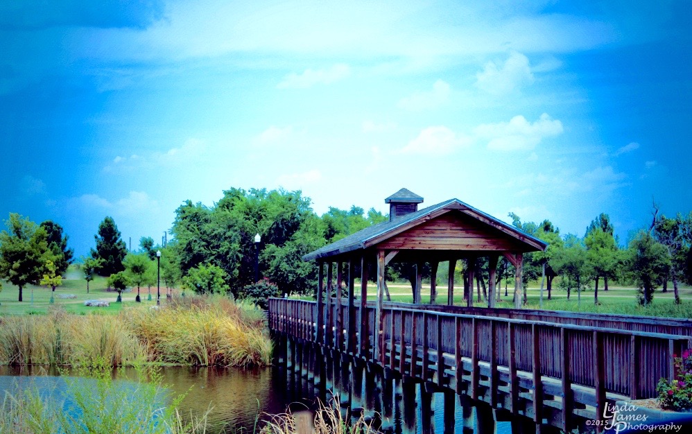 In my post, Fair Park –Childress, Texas, I shared how I found the city park in Childress, Texas when I took a turn off of Highway 287. I enjoyed a few hours taking photos at this pretty little lake in the park. I loved the wooden bridge that allows visitors to walk from one side of the lake to the other. The bridge also seemed to be a popular fishing spot.